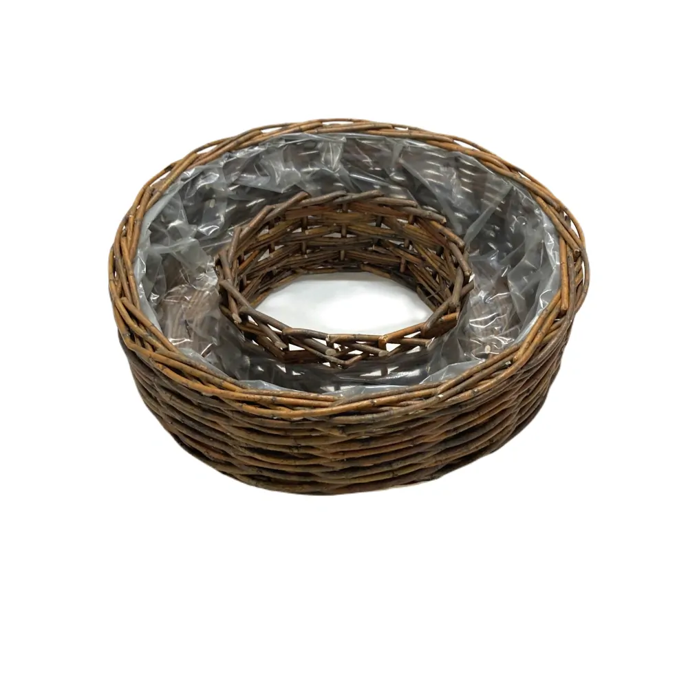 Proutěný květináč ve tvaru kruhu.